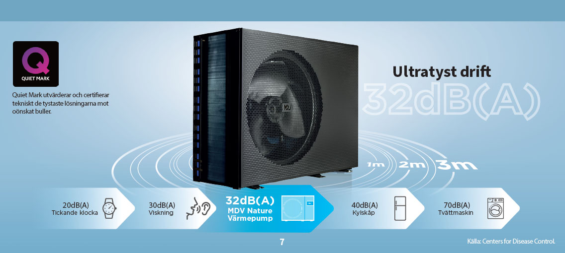 MDV värmepumpar är utvecklade med fokus på låg ljudnivå, vilket gör att de kan placeras vid bostaden utan att störa vare sig boende eller grannar.